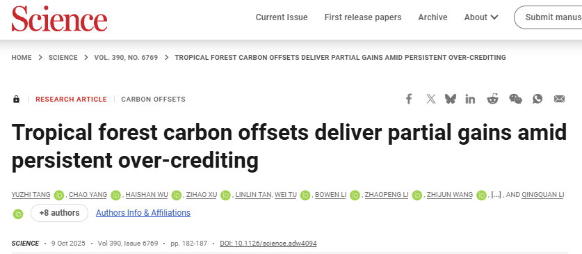 Tang Y, Yang C*, Wu H, Xu Z, Tan L, Tu W, Li B, Li Z, Wang Z, Guo K, Xiong S, Chen S, Zhang B, Tian J, Hu Y, Chen Z, Jonathan M C & Li Q*. Tropical forest carbon offsets deliver partial gains amid persistent over-crediting. Science, 2025, 390: 182-187.(DOI: 10.1126/science.adw4094)