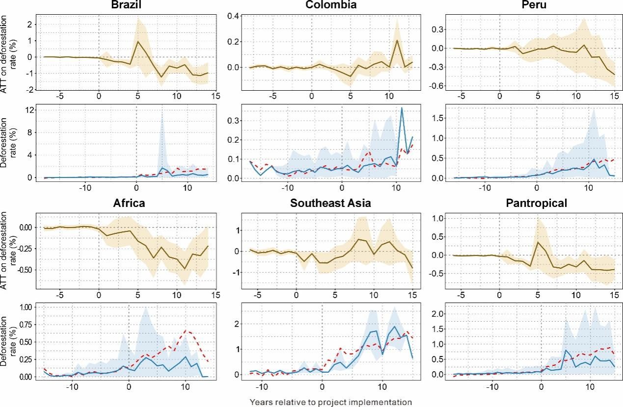 研究结果表明,近三分之一的项目单元(21/66)在实施REDD+项目后,森林实际损失面积显著低于基线损失面积,特别是位于巴西的项目,表明相关项目具有潜在的气候效益(图3)。然而,仅19%的项目(10/52)实现了项目开发方申报的毁林减少面积,约35%的项目(18/52)申报值超出实际估算10倍以上,其中哥伦比亚尤为突出,表明REDD+项目的气候效益存在系统性高估。就区域尺度而言,巴西、非洲和整个研究的泛热带地区在实施REDD+以来,毁林率呈显著的总体下降趋势,而哥伦比亚、秘鲁和东南亚则不具显著性(图4)。