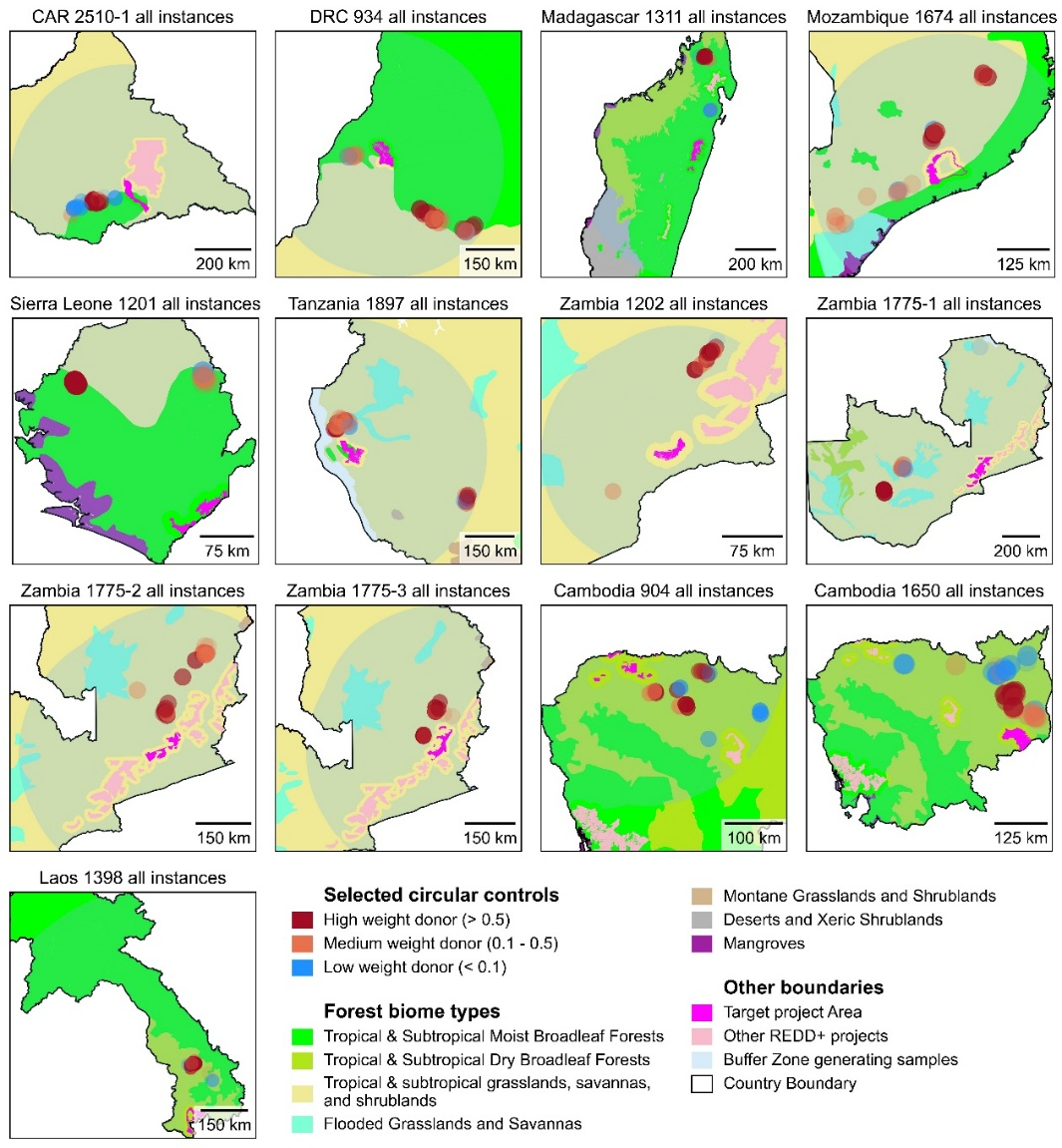 基于此,李清泉院士带领光明实验室和深圳大学团队开展攻关研究,评估了迄今为止最大规模的自愿REDD+项目的真实气候效益(涵盖12个热带国家共计52个自愿REDD+项目(66个项目单元))(图1)。团队基于多种合成控制法、多源遥感地理大数据和多轮随机实验,综合考虑各类时变毁林风险因子和时空特征匹配算法,发展了一套透明可靠的自愿性REDD+项目动态基线构建方法,实现了项目和区域尺度上的REDD+项目的气候效益的准确量化。该方法通过在项目区周边不受保护的地带,严格匹配与项目区实施REDD+前地理空间特征和历史森林砍伐动态一致的地块得到基线参考区(控制区)(图2),基线参考区的森林变化动态可认为是项目区未实施REDD+的基线情景。该方法生成的动态基线能够融合外部环境变化,有效克服传统静态基线无法反映毁林驱动因子动态变化的缺陷。同时,基线毁林面积可通过卫星影像监测得到,使计算更透明、验证更便捷,且不易被人为干预。