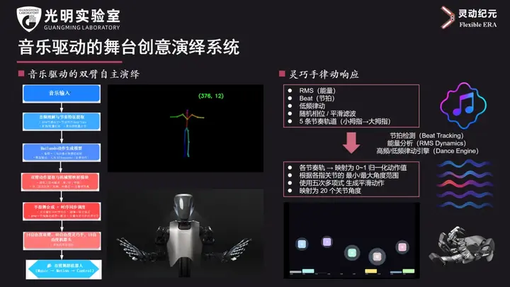 采用Bailando模型将《天地龙鳞》音乐旋律转化为舞蹈动作,驱动灵巧手双臂随节拍律动;20个精密关节根据音乐的高低频与能量变化,同步控制龙体昂首、摆尾等动态,让机械指尖在光影中演绎“数字龙鳞”的生命力。