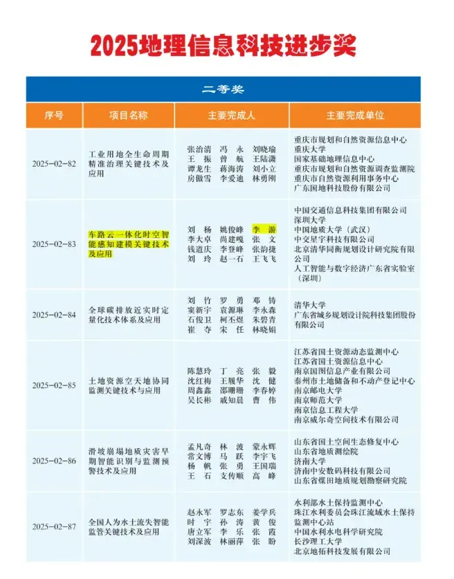 李游副研究员作为第三完成人参与的“车路云一体化时空智能感知建模关键技术及应用”项目,荣获2025地理信息科技进步奖二等奖。针对数据异构、场景动态变化快、语义融合难及孪生联动不足等问题,项目以时空智能感知与数字孪生深度融合为核心,以城市交通系统的智能治理为牵引,围绕“高精度感知—多模态融合—智能决策—平台支撑”的主线,在城市时空智能感知、多模态数字孪生建模、车路协同与智能决策等方面取得关键技术突破,实现北斗+5G高精度无缝定位、交通事件秒级感知及多模态实时融合重建。项目有效提升了城市交通的动态感知精度与智能决策能力,推动智慧交通从静态响应向智能协同转变,为城市治理数字化和智慧城市高质量发展提供了有力支撑。