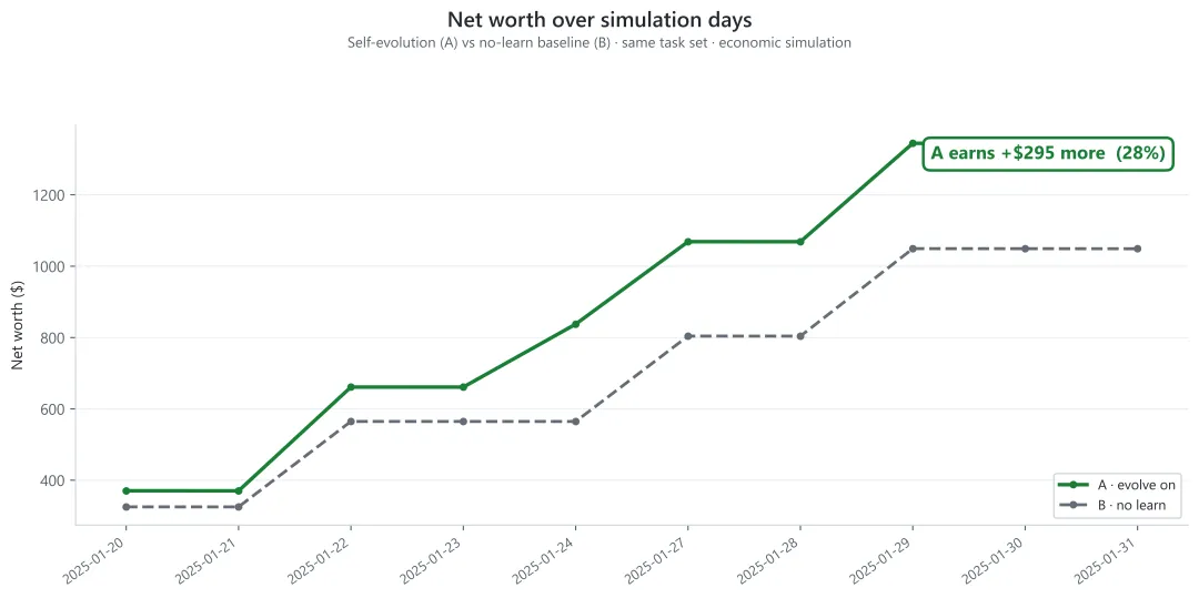 为了验证持续学习机制的有效性,我们在公开数据集上进行了10个真实任务的对照实验(任务顺序一致,初始资金均为 10 美元):